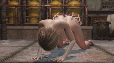 Ashley Graham lies on her hands and knees as a mysterious creature slowly inserts eggs into her uterus, filling it with its seed. The voice actress for this scene is KittenVox.
