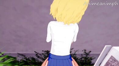 Hentai Porn Video Description: A sexy and busty blonde woman is lying on her back in bed, wearing a lacy black bra and matching thong. She has a cute little ponytail holder holding up one of her long locks as she lays there seductively. Suddenly, a handsome young man enters the room and approaches her. He starts to kiss her neck and nibble on her earlobes, making her moan with pleasure. As he continues his sensual assault, he slides off her bra and panties, exposing her perky breasts and shaved pussy. She gasps as he takes her hard, fucking her doggie style until she cums explosively.