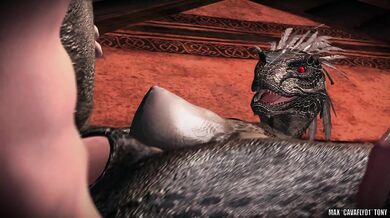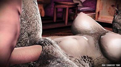 The tavern was alive with revelry, and Nurja saw an opportunity to have some fun before leaving the next morning. After a few drinks to bolster her courage, she began scanning the room for someone who could give her a good, intense fuck. Her search didn't take long as she soon found herself on the ground in a private bedroom with a man ready to bang her. They had to be discreet though, as the thin wooden walls weren't very good at blocking out noise.